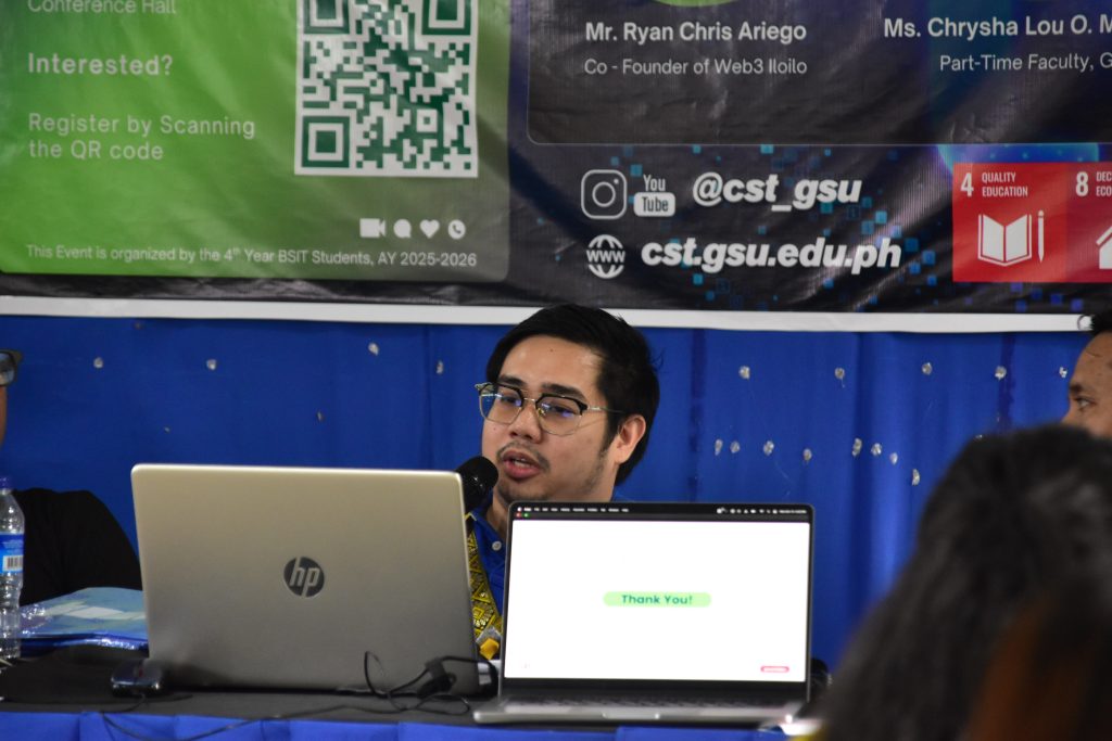 Following her was Mr. Ryan Chris Ariego, Co-founder of Web3 Iloilo, together with the Founder of Web3 Iloilo, who introduced the topic Zero-to-Blockchain. Their talk explored the fundamentals of blockchain technology, its wide-ranging applications, and its transformative role across different industries. The discussion encouraged students to venture into the growing digital ecosystem driven by blockchain innovation.