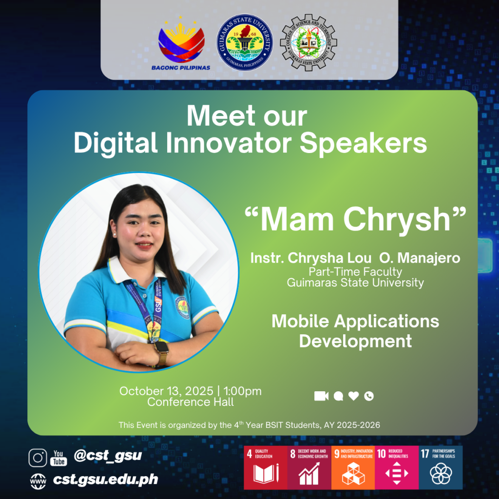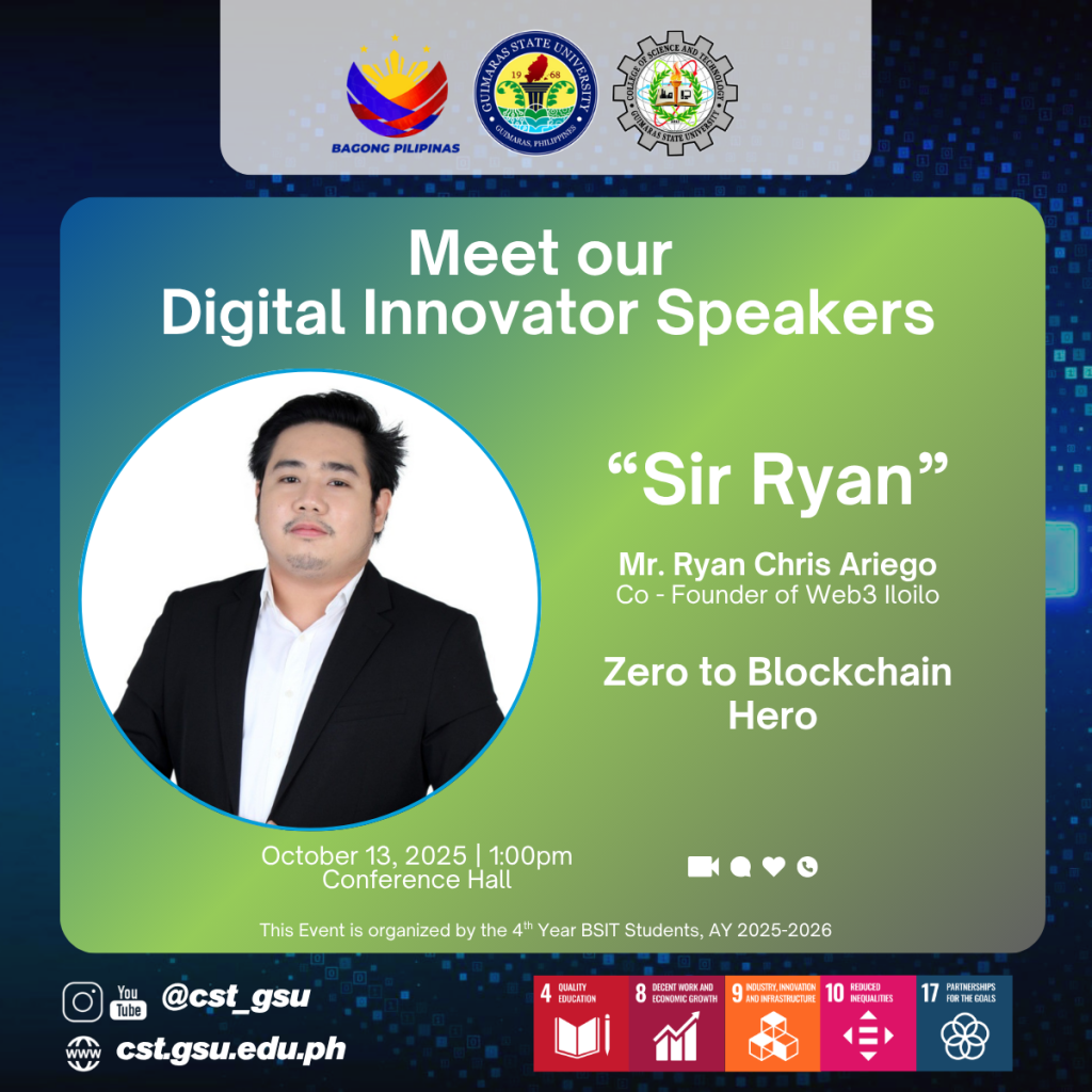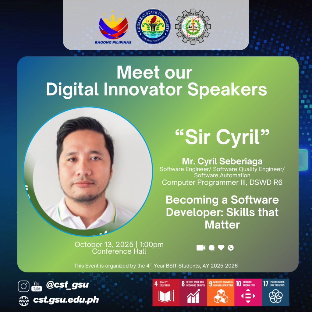 The College of Science and Technology (CST) conducted the Special Topics in IT: Digital Innovation Seminar on October 13, 2025, at 1:00 PM held at the GSU Mosqueda Campus Conference Hall. The event was actively participated in by all 4th-year Bachelor of Science in Information Technology (BSIT) students as part of their course requirement in Special Topics.