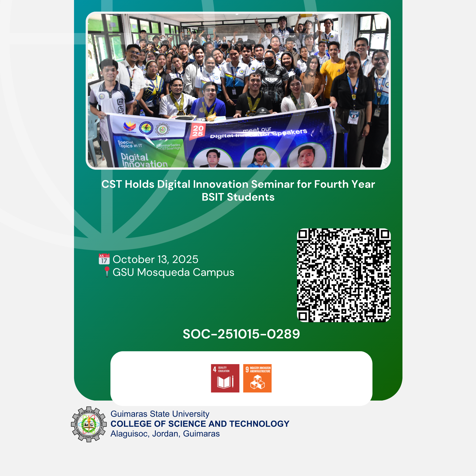 The College of Science and Technology (CST) conducted the Special Topics in IT: Digital Innovation Seminar on October 13, 2025, at 1:00 PM held at the GSU Mosqueda Campus Conference Hall. The event was actively participated in by all 4th-year Bachelor of Science in Information Technology (BSIT) students as part of their course requirement in Special Topics.