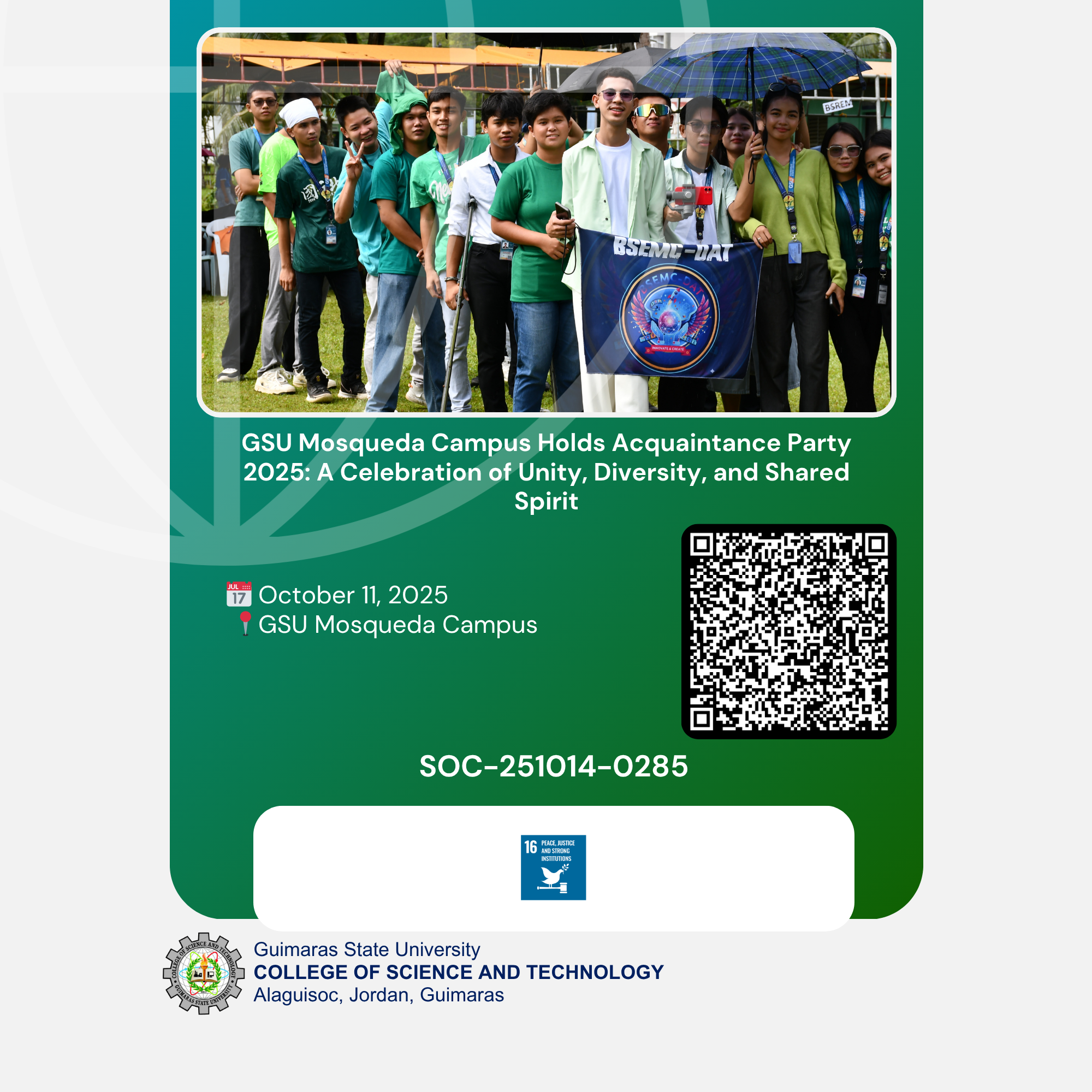 The Guimaras State University (GSU) Mosqueda Campus came alive with color and excitement during its Acquaintance Party held on Satudray, October 11, 2025 at the GSU Mosqueda Campus grounds. With the theme “Pag-Inupdanay 2025: Embracing Our Distinct Colors, Celebrating Our Shared Spirit, and Shining Together as One,” the event brought together the entire Mosquedians in a joyful celebration of unity, inclusivity, and togetherness.