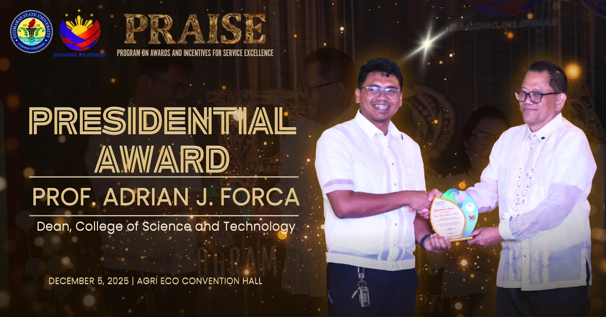 Prof. Adrian J. Forca, Dean of the College of Science and Technology (CST), was honored with a Presidential Award during the Program on Awards and Incentives for Service Excellence (PRAISE) 2025 Awarding Ceremony, held on December 9, 2025, at the Agri-Eco Convention Hall.
