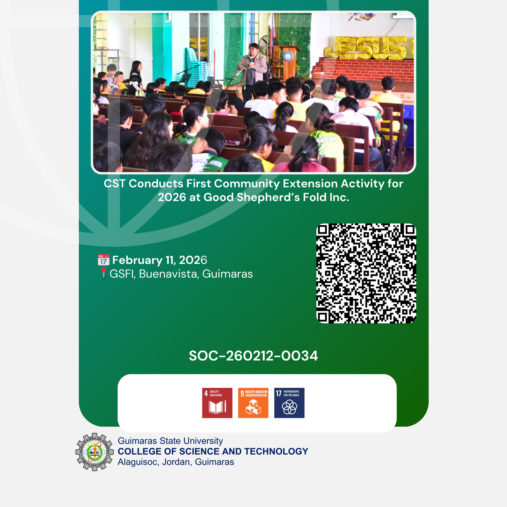The College of Science and Technology (CST) of Guimaras State University (GSU) successfully conducted its first community extension activity for the year 2026 on February 11, 2026, at Good Shepherd’s Fold Inc. (GSFI), Salvacion, Buenavista, Guimaras. The activity centered on Republic Act 10173, also known as the Data Privacy Act, with the goal of educating students and faculty members on the responsible handling of personal data.
