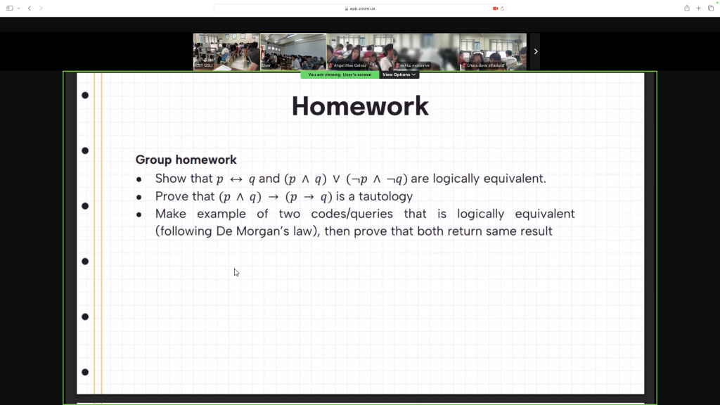 The session was still attended by second-year Bachelor of Science in Computer Science (BSCS) students from CST together with participating students from ITS. The class was focused on Logical Equivalence and was held virtually via Zoom, allowing students from both institutions to interact and participate in a shared learning environment despite being in different countries.